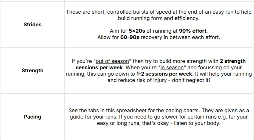 Each type of run in your training plan (e.g. easy, tempo, speed/intervals, long) is clearly explained so you're not left scratching your head.
